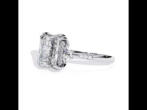 The Radiant Hidden Halo with Three Stone Engagement Ring showcases a stunning radiant-cut center stone, enhanced by a hidden halo underneath. It is beautifully complemented by two side stones, creating a captivating and elegant design.