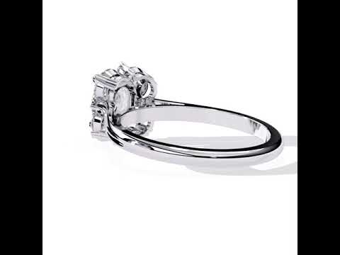 The Oval with Unique Halo Engagement Ring showcases a stunning oval-cut center stone, encircled by a one-of-a-kind, custom-designed halo that offers a contemporary and striking appearance.